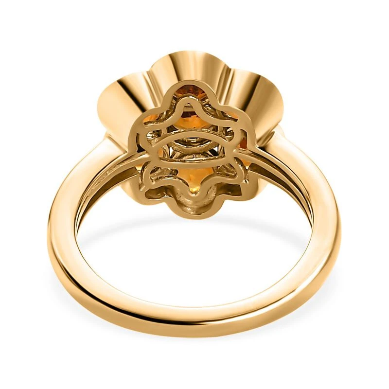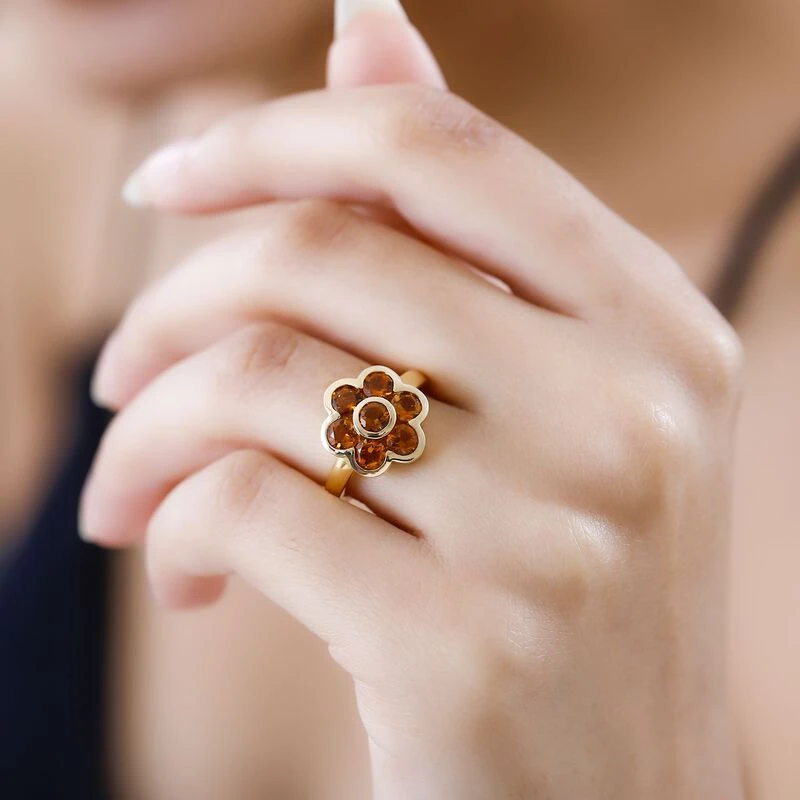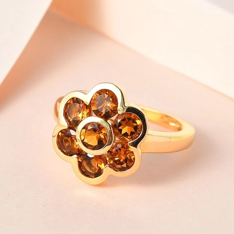 Dieser Ring für Damen betont Ihren weiblichen Charme und Ihre Anmut und ist mit einem floralen Muster versehen. Die orange-bernsteinfarbenen Farbtöne von 7 Citrin, die in das Schmuckdesign dieses Damenrings gefasst sind. Dieser vergoldete Silberring wiegt 3,7 Gramm und verleiht Ihnen einen hellen Farbton.