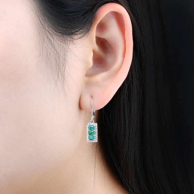 Diese Ohrhänger für Damen sind im Trilogie-Design gestaltet und mit 6 hochwertigen Smaragden besetzt, die von 38 Zirkonen umrahmt werden. Die 2 Gramm Trilogie-Ohrringe für Damen glänzen in rhodiniertem Silber und sind mit einem Klappverschluss versehen.