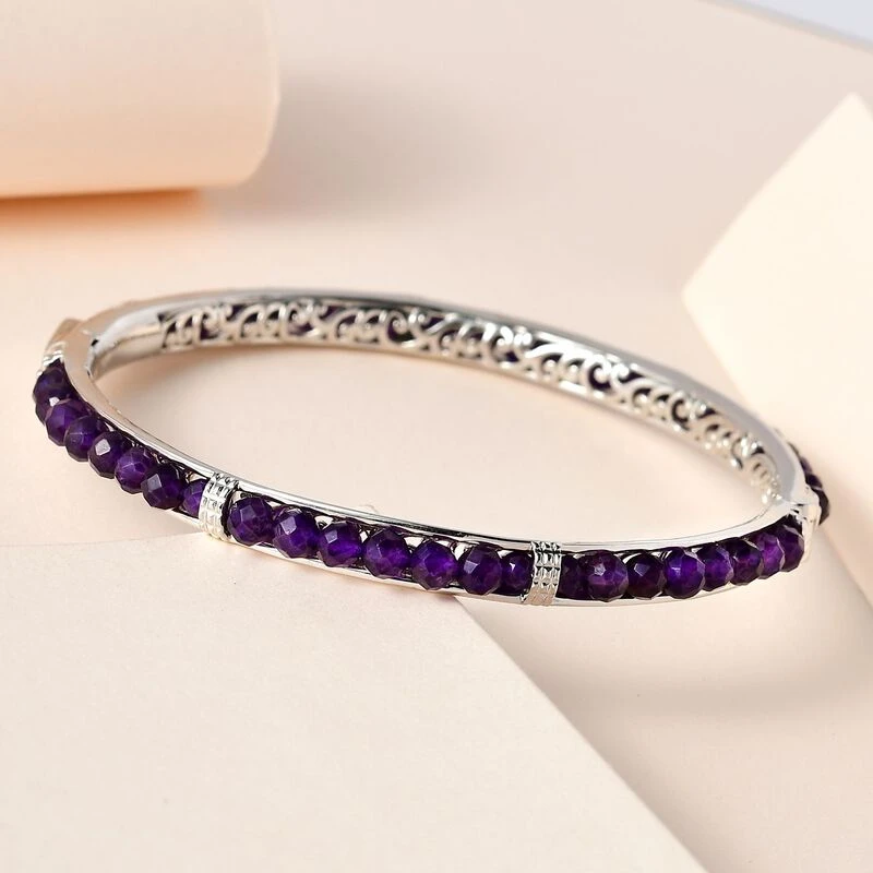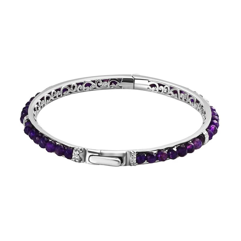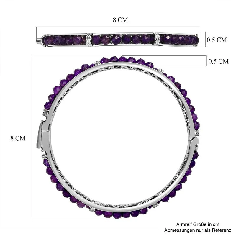 Dieser elegante Armreif für Damen ist im Eternity-Design gestaltet und mit 46 Amethyst-Perlen verziert. Das tiefe Violett des Amethysts wird durch die kunstvollen Schnörkel auf der Innenseite des Armreifs hervorgehoben. Der Klickverschluss macht das Styling dieses Amethyst-Armreifs einfach.