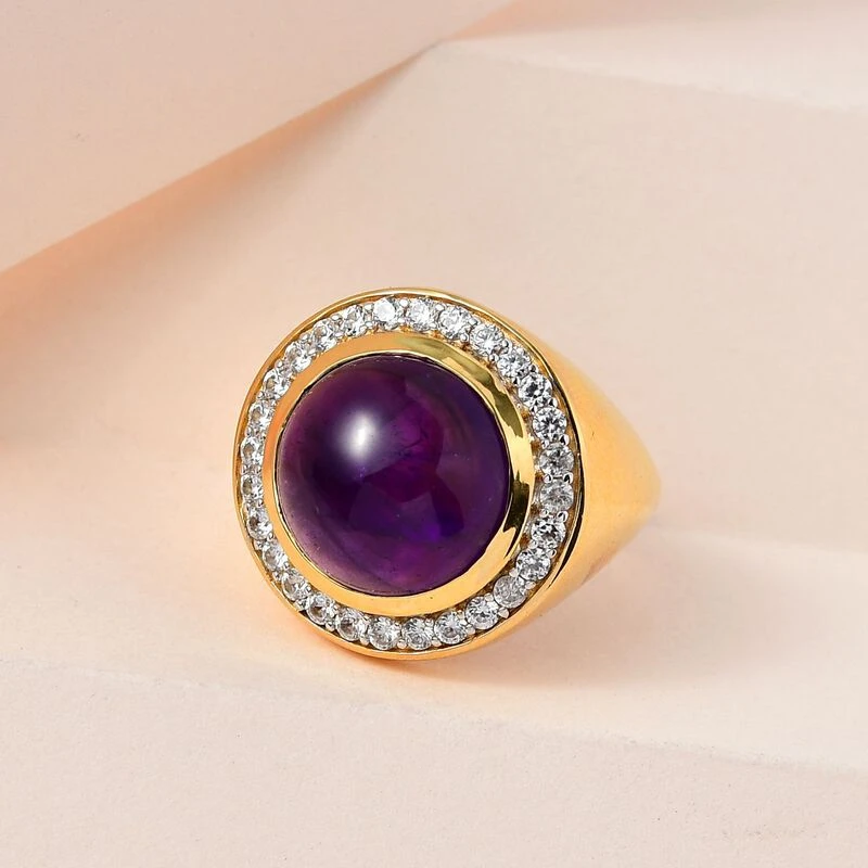 Dieser gewagte Designer-Ring für Damen ist mit den üppigen violetten Farbtönen eines Amethysten geschmückt, die durch das Funkeln von Zirkonen ergänzt werden, die einen Halo bilden. Der Halo-Ring für Damen ist eine Mischung aus Klassik und Moderne, gegossen aus 6,9 Gramm vergoldetem Silber.