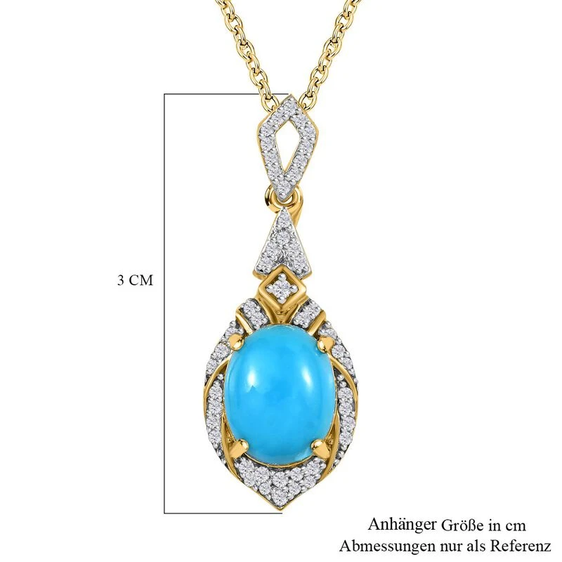 Dieser Türkis-Anhänger für Damen wird durch das Funkeln von 47 Zirkonen akzentuiert, die ihn zum perfekten Party-Schmuck machen. Dieser 3,6 Gramm Türkis-Schmuck wird mit einem Karabinerverschluss gesichert und ist aus Silber gegossen, das mit Gelbgold Vermeil überzogen ist.