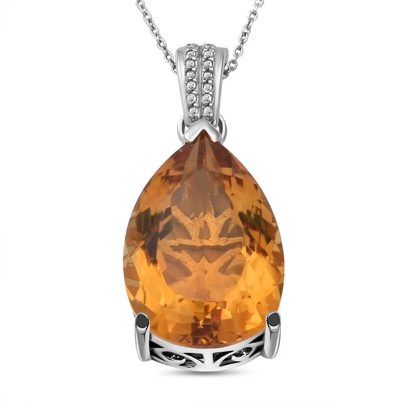 Citrin Und Weißer Zirkon-Anhänger Mit Kette, 925 Silber Platiniert Ca. 25,14 Ct