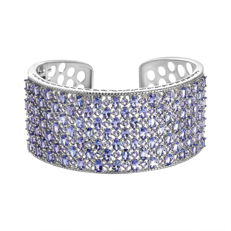 Hinterlassen Sie einen bleibenden Eindruck mit diesem Armreif, auf dem ein Cluster aus 175 Tansaniten zu sehen ist. Der Tansanit, der nur in Tansania vorkommt, gilt aufgrund der geschlossenen Mine und der schwindenden Ressourcen als selten. Der 45,8 Gramm Armreif ist aus platiniertem Silber gefertigt und leicht zu stylen.