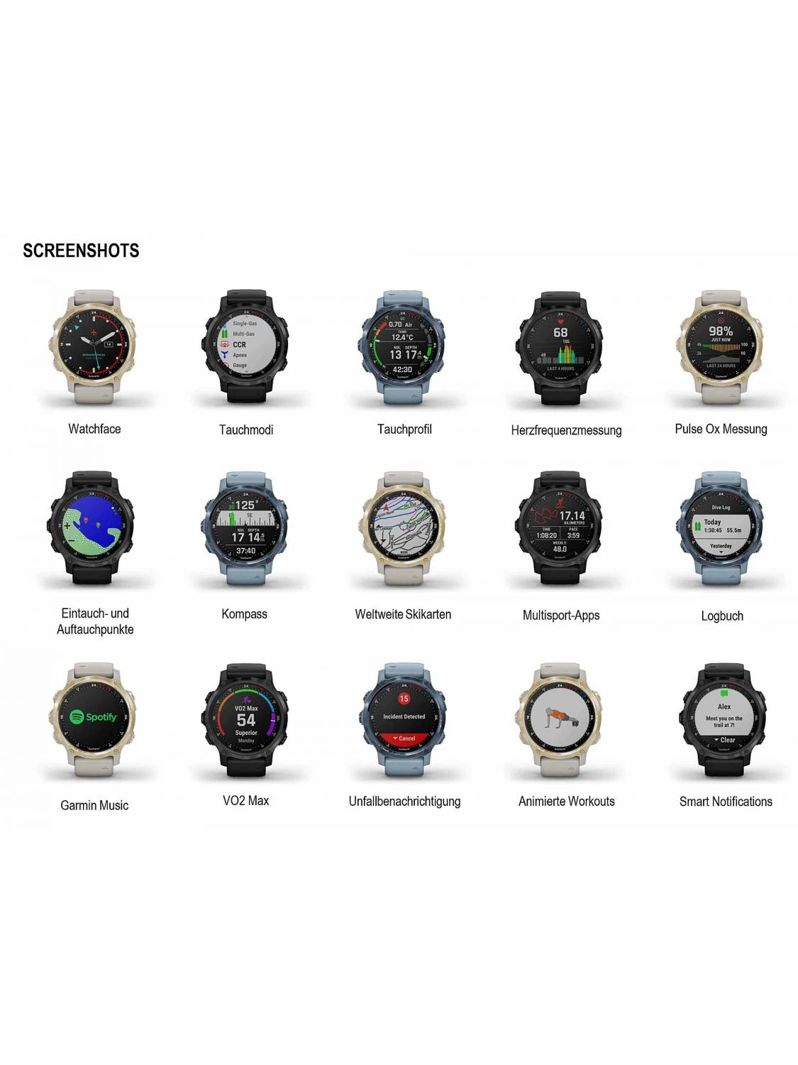 - umfassende Tauchfunktionen wie Tauchtiefe, Tauchzeit, Wassertemperatur, Abstiegs-/Aufstiegsrate, etc.