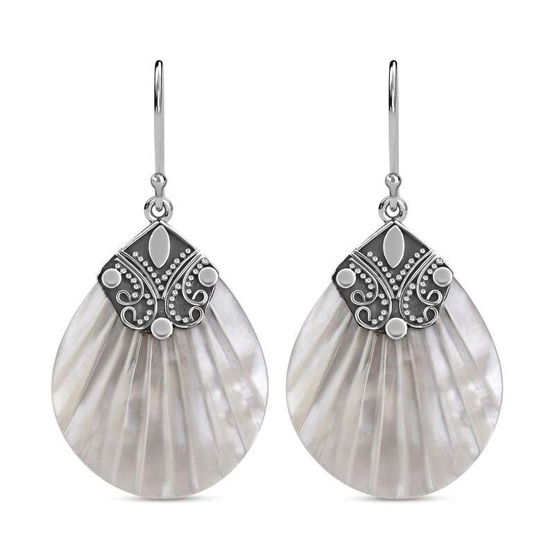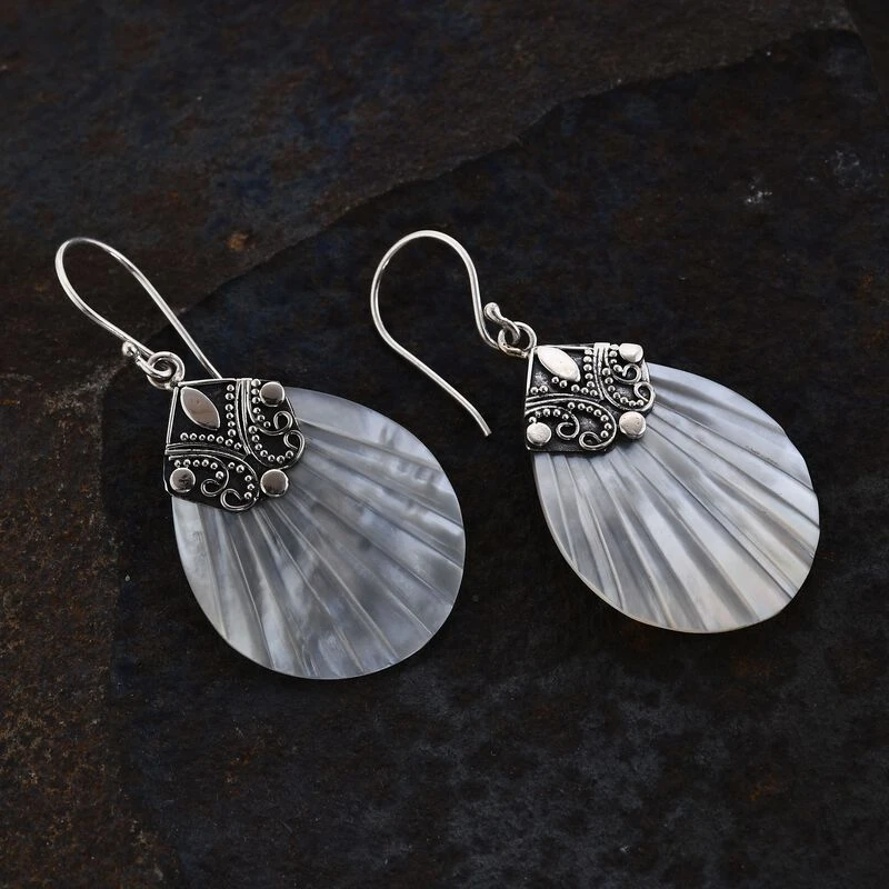 Diese muschelförmigen Perlen-Ohrringe für Damen haben einen schönen, leuchtenden Schimmer. Die handgefertigten 3 Gramm Silber-Ohrringe mit Hakenverschlüssen sind mit Schnörkeln und Millgriff-Arbeiten verziert. Diese Ohrringe für Damen bringen die Kunstfertigkeit von Bali in Ihre Schmuckkollektion.