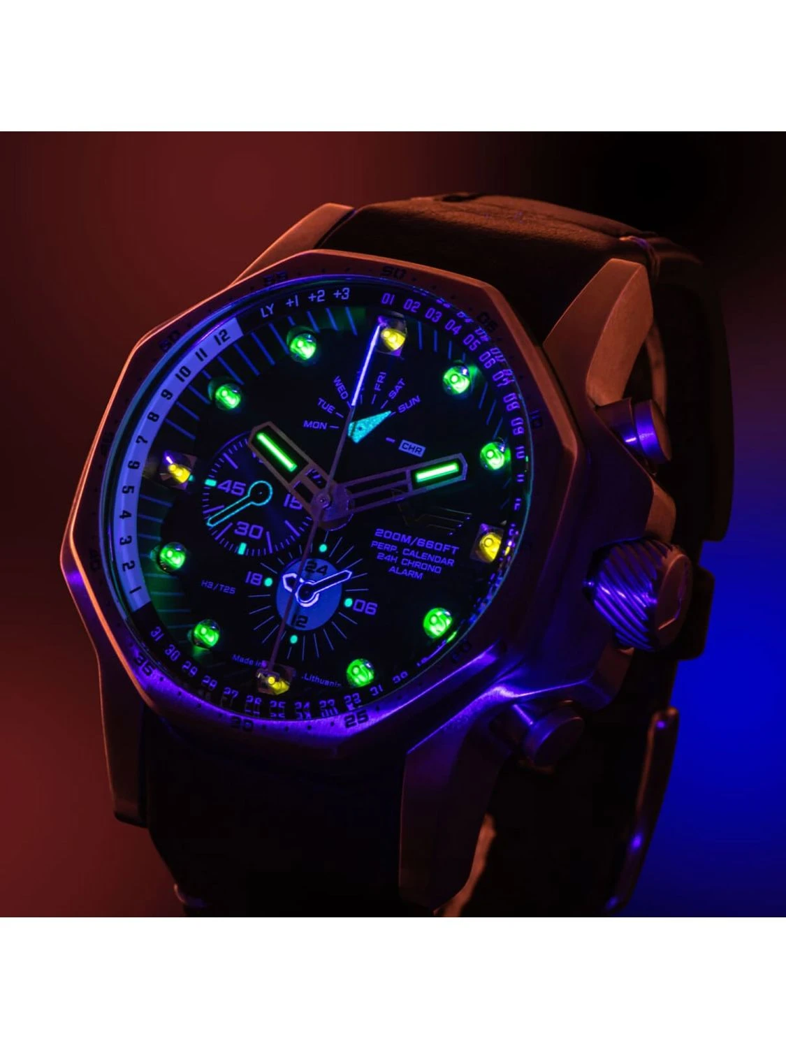 - Zeiger und Stundenmarkierungen mit Swiss Made Tritiumgaslichtquelle (TGLQ)