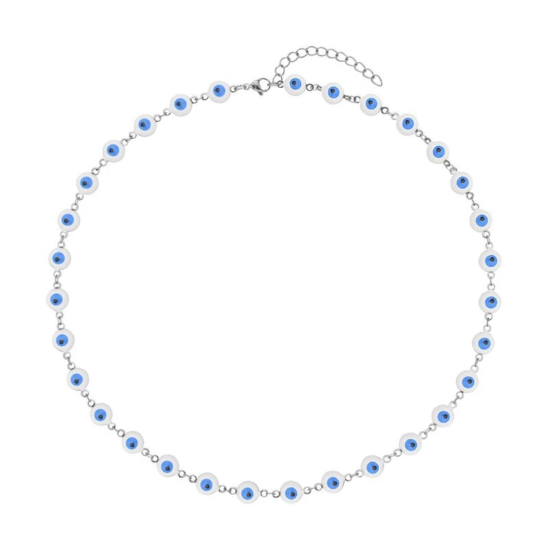 Diese Halskette ist ein beliebtes Motiv, das das Böse abwehren soll. Sie ist in Weiß- und Blautönen emailliert, um das böse Motiv zu kreieren. Die skurrile Halskette mit modernem Charme sitzt am Dekolleté und wird mit einem Karabinerverschluss geschlossen.