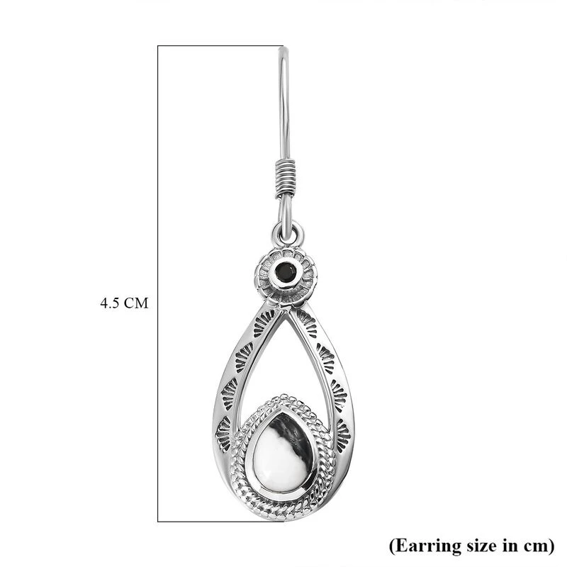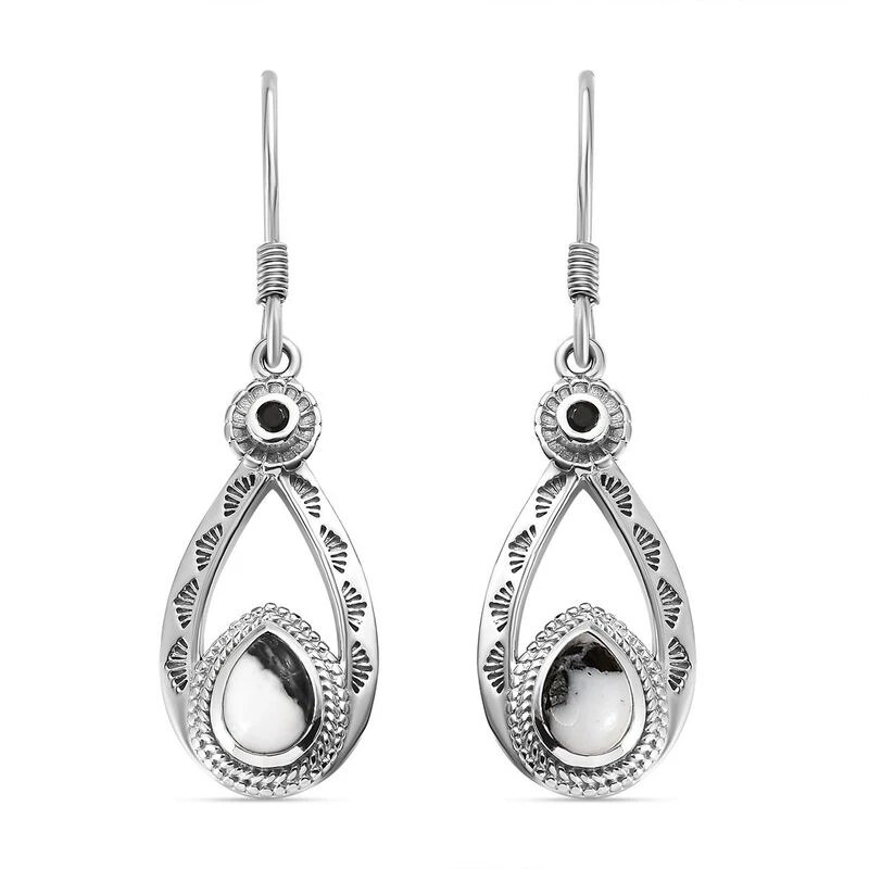 Diese kunstvollen Designer-Ohrringe für Damen zeigen die Schönheit von 2 einzigartigen weißen Büffeln, die von 2 schwarzen Spinellen akzentuiert werden. Die stilvollen 5 Gramm Silberohrringe für Damen unterstreichen die Yin- und Yang-Farben des Büffel-Edelsteins und werden mit Hakenverschlüssen getragen.